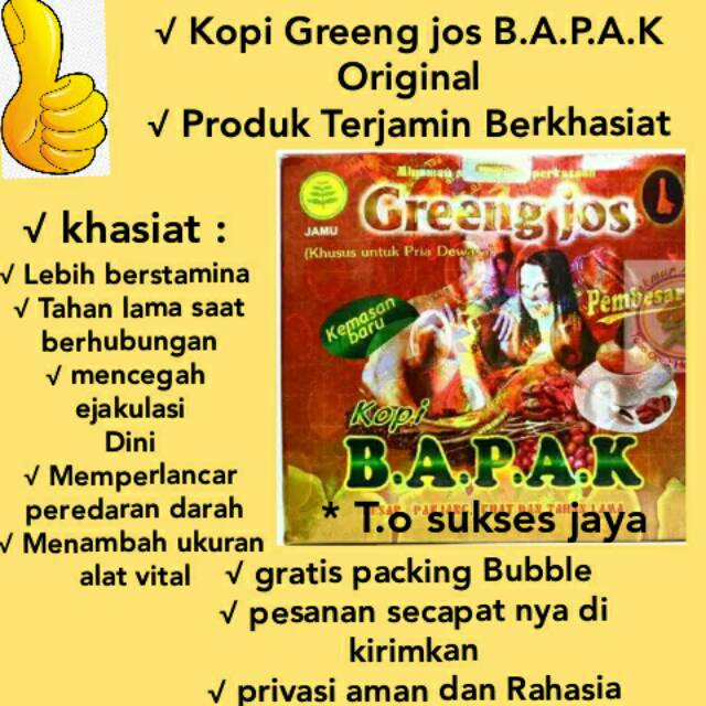 Pak di Tokopedia Promo Pengguna Baru Cicilan 0 Kurir Instan. Kopi Greeng Jos Kopi BAPAK Besar Panjang Kuat dan Tahan Lama Kopi khusus Pria Dewasa. Cari produk Kopi Kemasan lainnya di Tokopedia.
