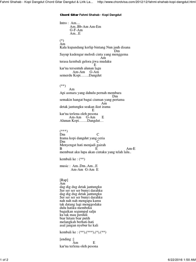 Am pagi ini terasa ku nikmati Am Ku sambut pagi dengan segelas kopi. Am Am Am Am Am Am Am Am Am -E Am Kala kupandang kerlip bintang nan Am jauh disana Am Sayup kudengar melodi Dm cinta yang menggema Dm Terasa kembali gelora Am jiwa mudaku Am E Karena tersentuh alunan lagu Am Am Semerdu kopi dangdut Am Api asmara yang dahulu Am pernah membara Am Semakin hangat. TRIBUNNEWSCOM - Berikut ini chord gitar lagu berjudul Kopi Dangdut yang dipopulerkan oleh Fahmi Shahab.