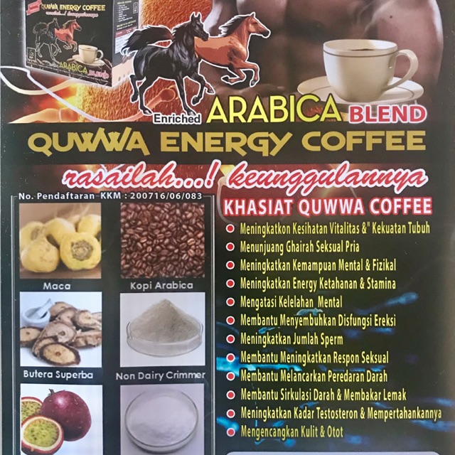 HP 085265808399 KHASIAT QUWWA ENERGY COFFEE. The Arabic word qahwah originally referred to a type of win whose etymology is given by Arab lexicographers as deriving from the verb qahā قها to lack hunger in reference to the drinks reputation as an appetite suppressant34 The word qahwah is sometimes alternatively traced to the Arabic quwwa power energy or to Kaffa a. - Meningkatkan kesehatan vitalitas dan kekuatan tubuh - Mengatasi lemah sahwat - Meningkatkan kemampuan Mental Fisik - Meningkatkan energy Ketahanan dan stamina - Meningkatkan jumlah sperma - Membantu meningkatkan respon seksual.