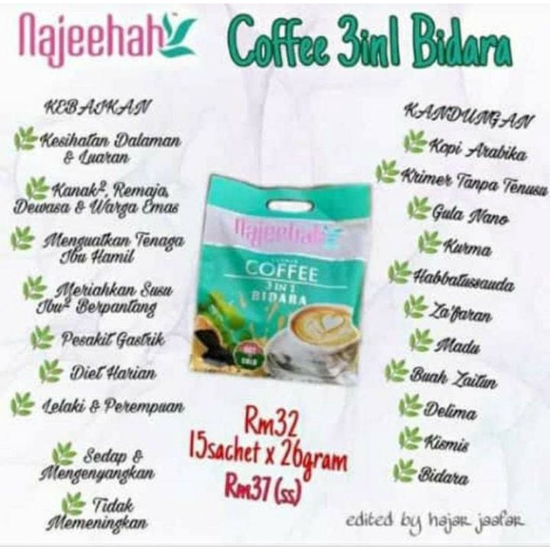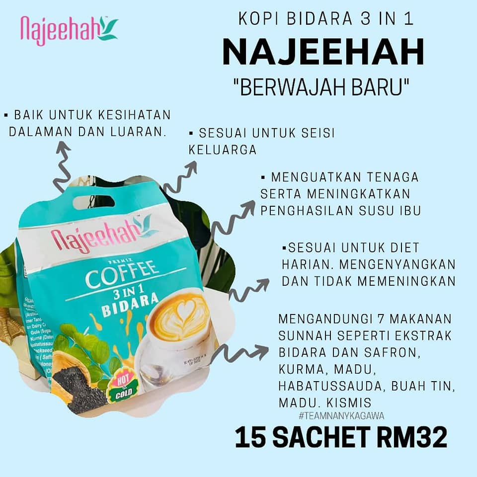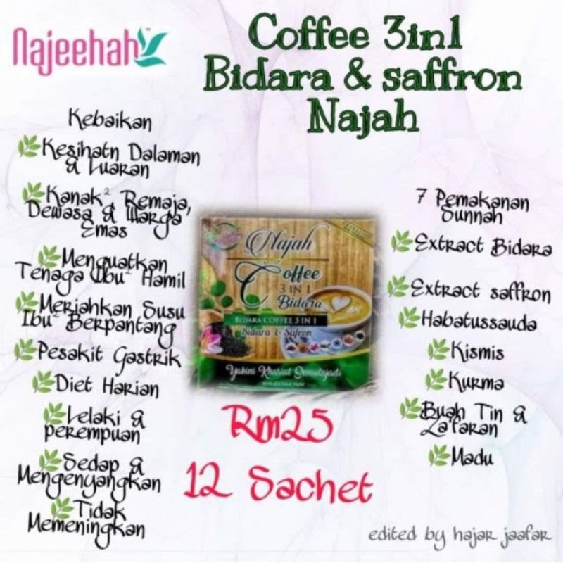 116 likes 1 talking about this. Yakini khasiat semula jadi. Coffee 3in1 Bidara Saffron Najah Najeehah 12 Sachets.